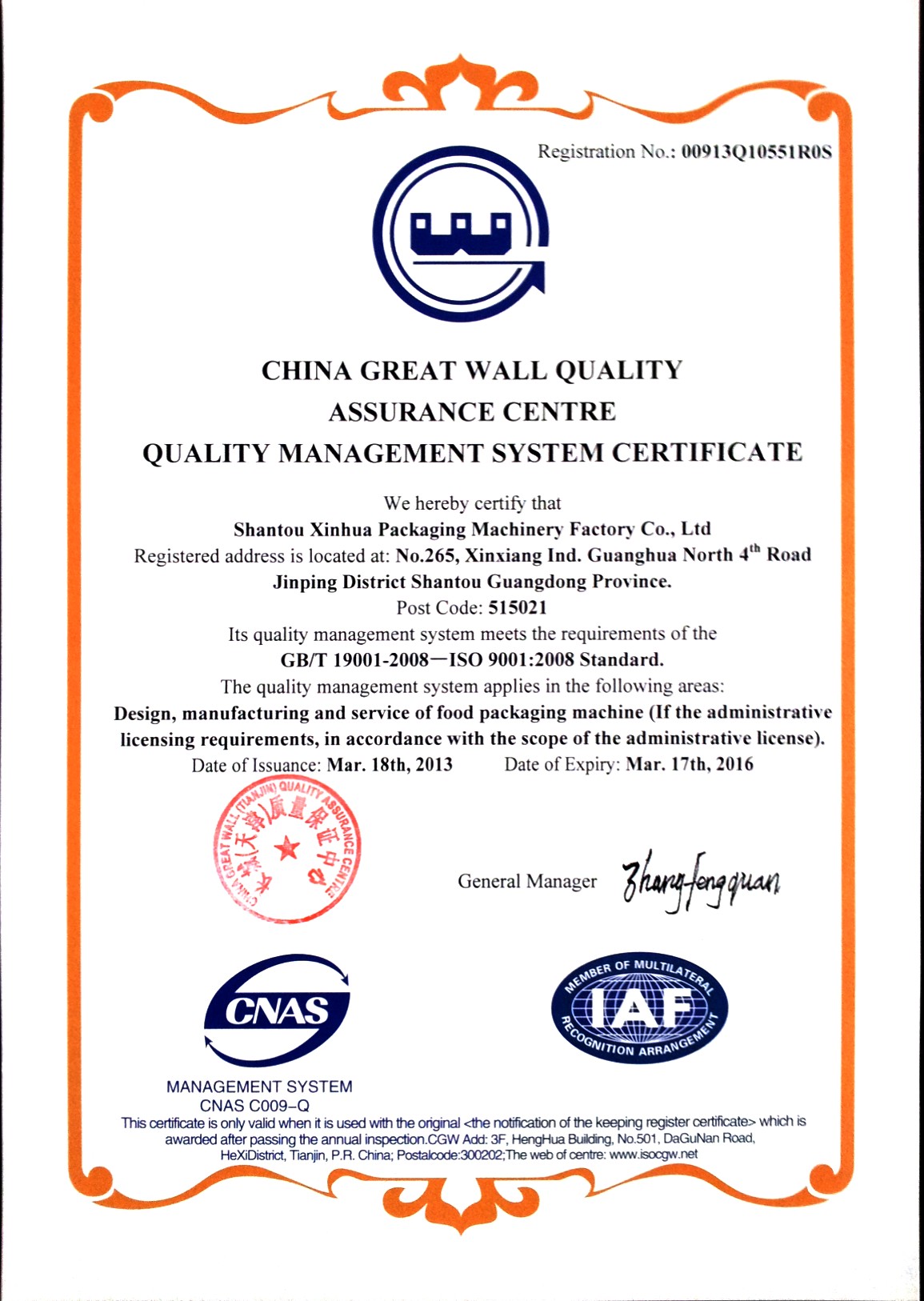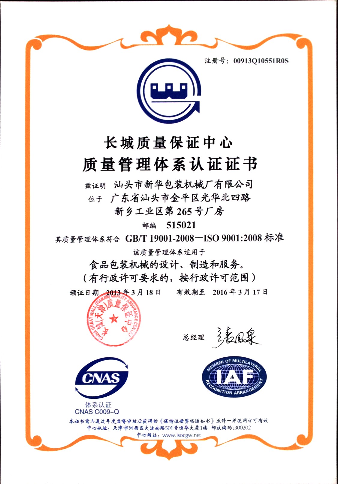 2013年3月9日、10日,长城(天津)质量保证中心审核组专家莅临公司,对我司质量管理体系运行情况进行全面、严格、细致的指导和审核。审核组专家认为:我司自建立质量管理体系以来,导入质量管理体系标准及建立质量管理体系目的明确;高层领导管理思 路清晰,体系策划总体要求目标明确;能够坚持“以顾客为关注焦点”的理念,密切关注顾客需求;坚持管理创新、技术领先、品质第一的发展理念理,建立起高起点的文件化体系,重视产品质量管理,建立了供方控制体系;在质量管理体系的建立和全面实施过程中,组织的质量方针与目标得到保持,持续改进的机制已基本形成。审核组专家确认我司质量管理体系符合ISO9001:2008质量体系标准的要求。2013年3月18日,质量保证中心向我司正式颁发了ISO9001:2008质量管理体系认证证书。
